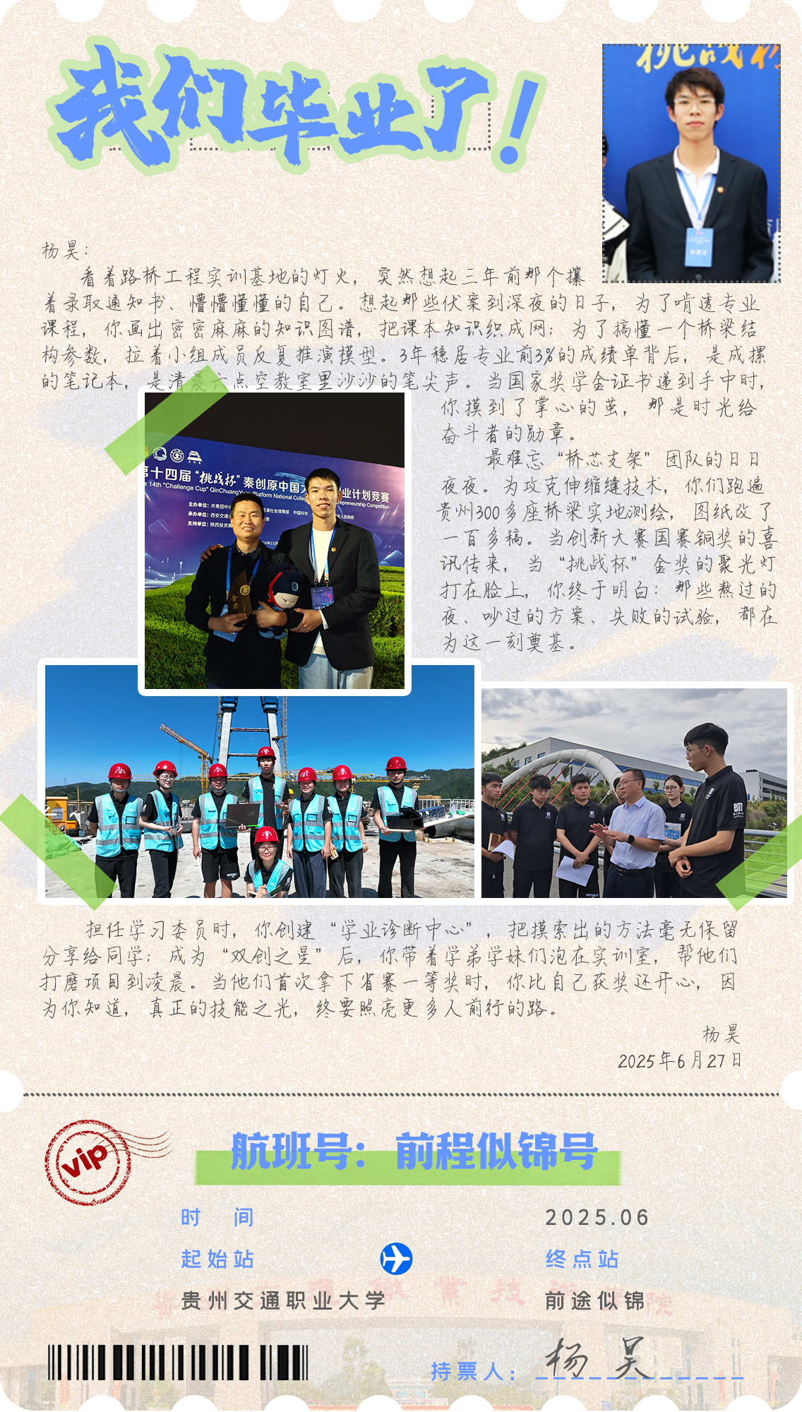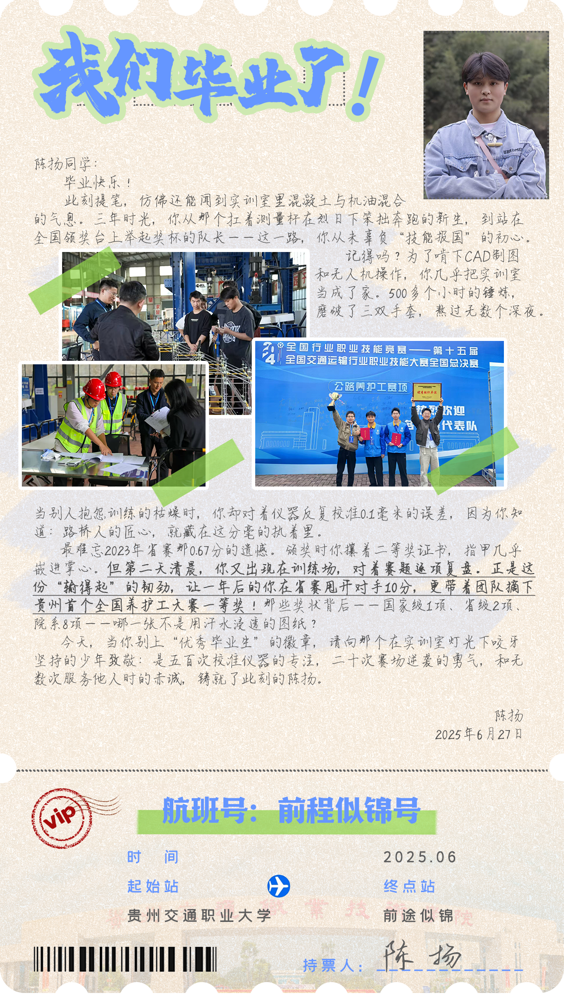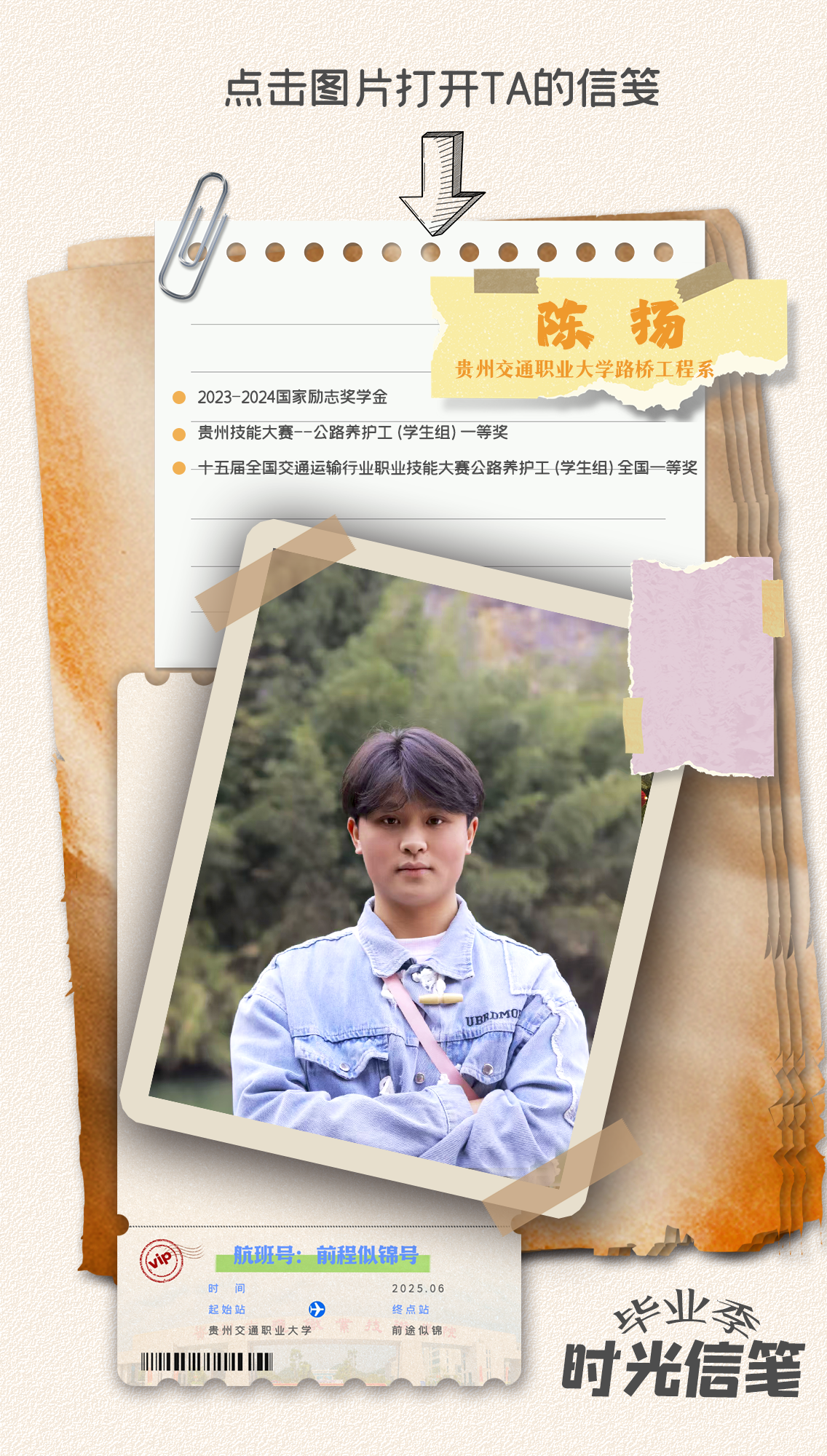 在2025届毕业生即将扬帆起航之际,多彩贵州网特别策划《毕业季时光信笺》,邀请贵州交通职业大学的毕业生写下跨越时光的信件。接下来,就跟随本栏目,启封这份属于贵州交通职大毕业学子的独家记忆,见证那些在时光长河里熠熠生辉的奋斗足迹!