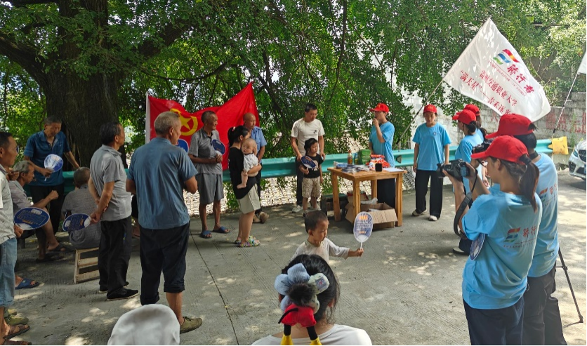 在德江县荆角土家族乡尖山村百年银杏树下,满天星——青禾逐光实践团创新采用“一树、一扇、一堂课”的形式,组织村里的老人和儿童集中开展宣讲活动。通过发放定制的反诈手扇、开展趣味知识问答等方式,向村民讲解反诈防骗、防火安全、防溺水常识以及交通安全等内容。