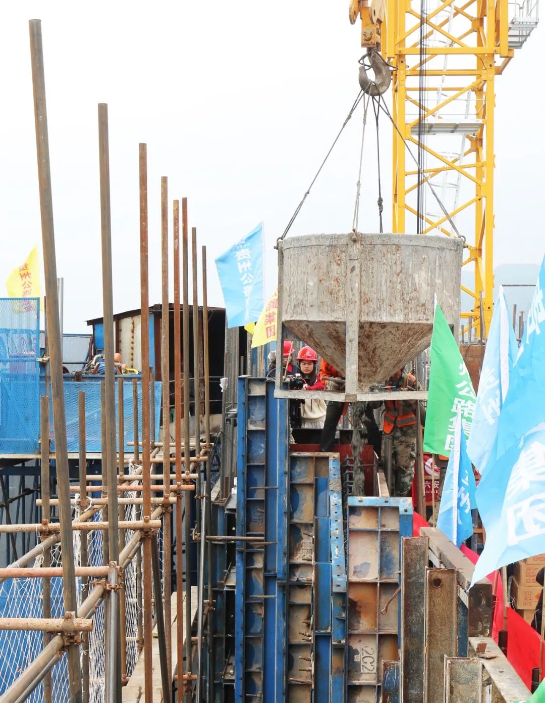 面对高标号泵送混凝土工作性能要求能达到超流态和自密实效果的技术难题,六安公司技术团队从多方向、多角度进行技术攻关,反复进行施工配合比试配、比较分析,筛选最优配比成果,最终成功解决超高泵送和主塔结构局部空间小、钢筋密、无法或无需振捣的技术难题,为大桥顺利封顶打下坚实基础。