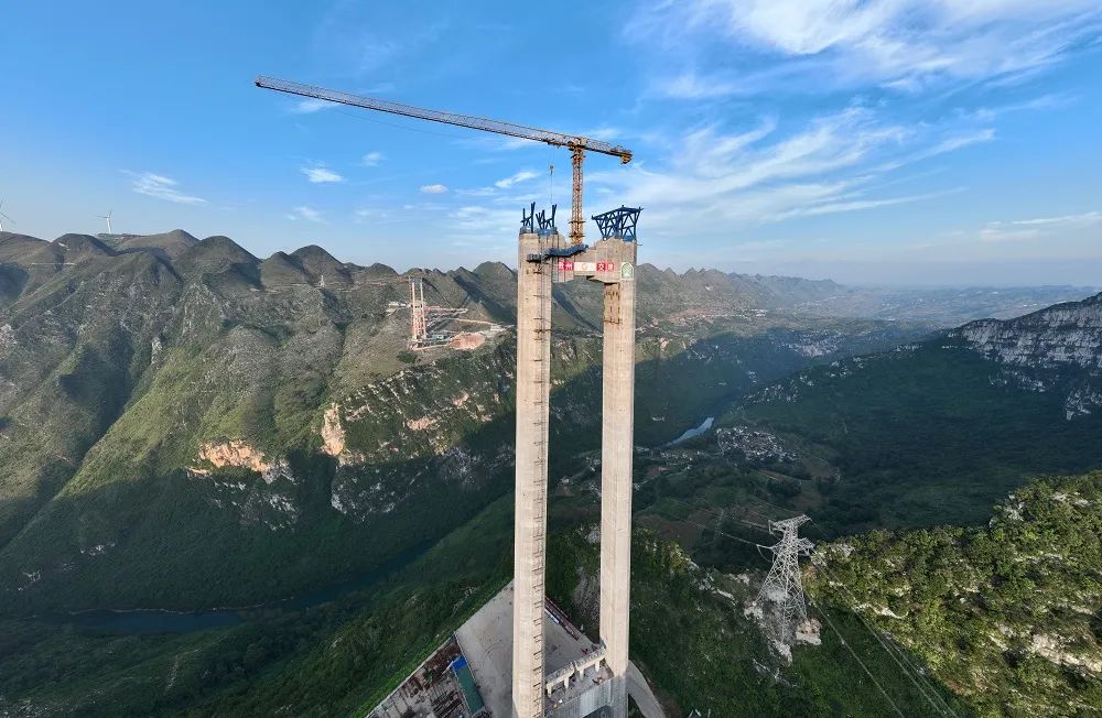 穿越峡谷的大风在耳边呼啸,脚下是深达数百米的花江大峡谷,眼前封顶已久的安龙岸主塔在清晨的阳光中熠熠生辉。