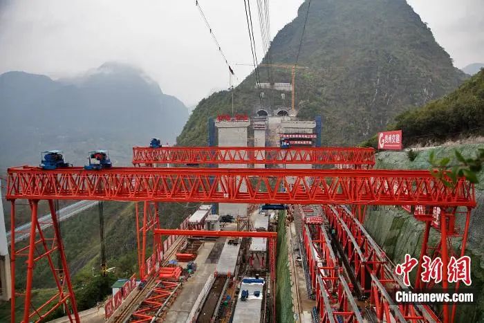 贵州交建集团子集团贵州公路集团第八工程公司总工程师刘骁凡在施工现场告诉中新网记者,乌蒙山大桥左幅全长491.5米,右幅全长511.5米,是典型的双向6车道上承式拱桥。该桥矢跨比为1:5,跨越阿志河峡谷及两侧斜坡而建,桥型方案结合桥址处地形、地质条件、危岩带等实际情况,主拱圈采用的是钢桁-混凝土组合结构,这种结构在拱桥上第一次采用。