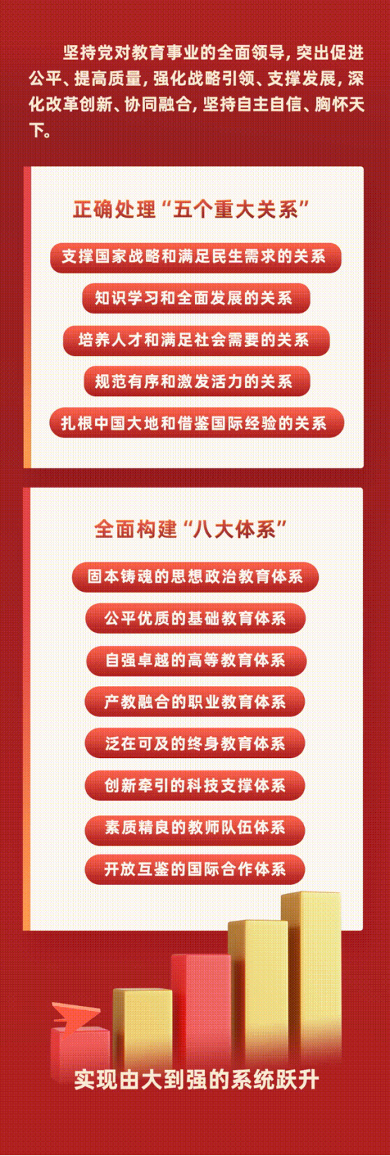 《纲要》提出,要坚持党对教育事业的全面领导,突出促进公平、提高质量,强化战略引领、支撑发展,深化改革创新、协同融合,坚持自主自信、胸怀天下。正确处理支撑国家战略和满足民生需求、知识学习和全面发展、培养人才和满足社会需要、规范有序和激发活力、扎根中国大地和借鉴国际经验的关系,全面构建固本铸魂的思想政治教育体系、公平优质的基础教育体系、自强卓越的高等教育体系、产教融合的职业教育体系、泛在可及的终身教育体系、创新牵引的科技支撑体系、素质精良的教师队伍体系、开放互鉴的国际合作体系,实现由大到强的系统跃升。