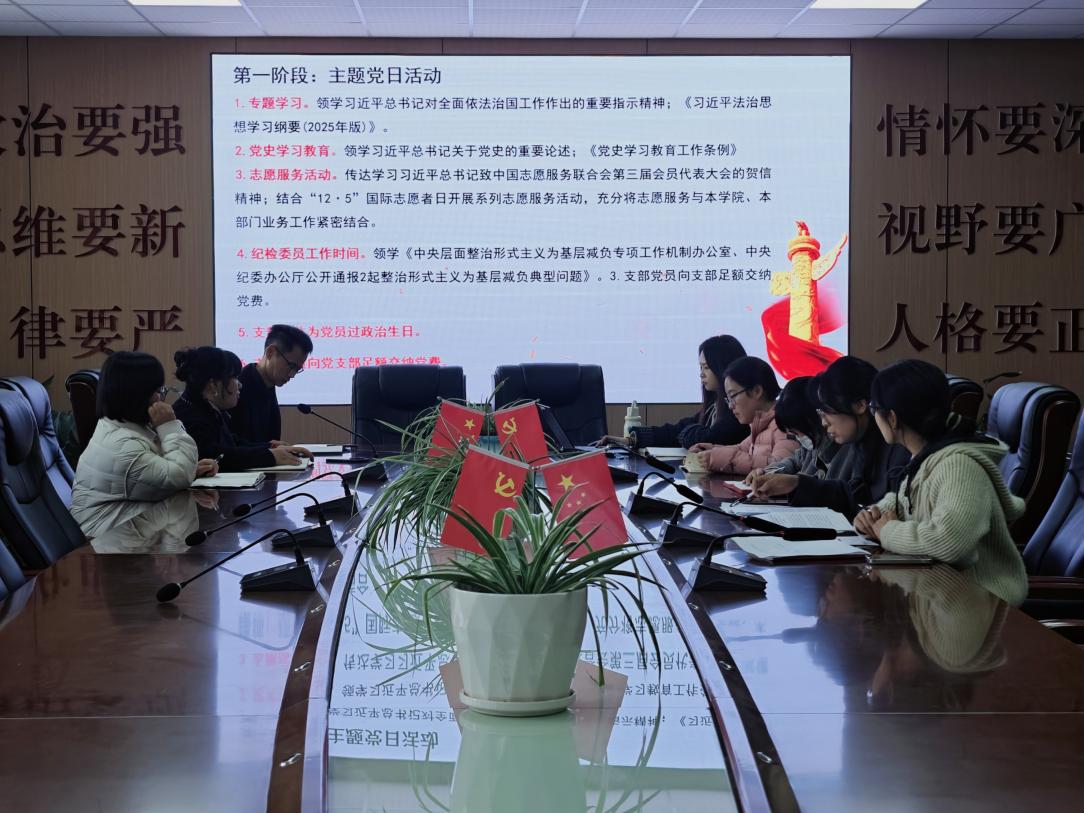 专题学习环节,支部书记宫秀琪同志传达学习习近平总书记对全面依法治国工作的重要指示精神,解读《习近平法治思想学习纲要(2025年版)》,强调高校党员教师需将法治思维融入教学科研,服务法治人才培养。
