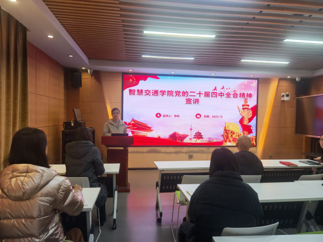 12月31日中午,智慧交通学院在博通楼四楼会议室举行党的二十届四中全会精神宣讲暨专题党课。本次党课创新采用“理论+实践”“书记+院长”双人协同宣讲模式,由学院党委书记张耘同志与学院党委副书记、院长彭鸿同志共同主讲,学院全体教职工及学生代表参加学习。