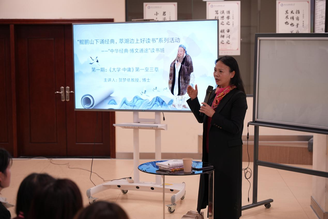 30日晚上,由省级语言文字推广基地(贵州交通职业大学)主办,通识教育学院、校图书馆承办的“鲲鹏山下诵经典,萃湖边上好读书”系列活动之“中华经典·博文通途”读书班活动第一期在图书馆401沙龙空间成功举行。本期活动聚焦中华经典《大学》一书中的第一至三章,由贵州交通职业大学副校长、教授、博士贺梦依带领同学们一起领略先秦儒学的博大精深与永恒智慧。活动伊始,贺梦依先给同学们介绍了儒学、道学和禅学的智慧,并结合生活实际对“...